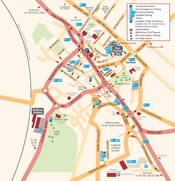 There are several areas in the centre of Penrith where you can park free of charge on the street, but you will need to display a parking disc. These zones are marked with road-side signs.There are no limits before 8am and after 6pm. You have a few minutes to obtain a free clock disc from a nearby shop. On Tuesdays, the disc zone in Great Dockray becomes a market site and there’s no general parking available there from 8am - 6pm. For the latest information and up to date charges, visit Westmorland & Furness Council website.