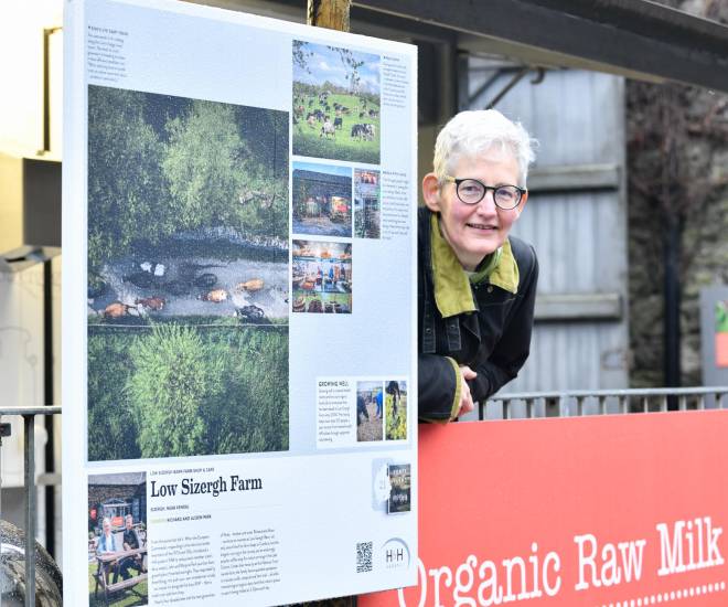 You can visit this unique, free exhibition at the award winning Low Sizergh Barn on the outskirts of Kendal. An organic dairy farm with an award-winning farm shop and café, Low Sizergh is itself one of the Forty Farms, and the outdoor exhibition gives a unique insight into farming in Cumbria, in a setting that carries visitors deep into the Lake District landscape at the heart of the Forty Farms journey. Low Sizergh Barn is one of the farms featured in the book and the exhibition.