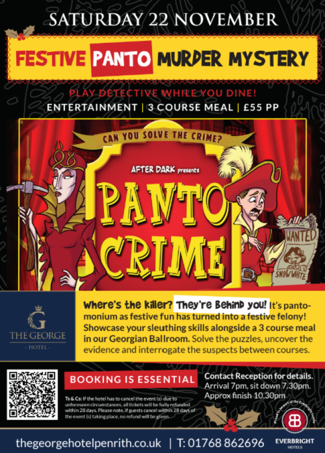 Showcase your sleuthing skills alongside a 3 course meal in our Georgian Ballroom. Solve the puzzles, uncover the evidence and interrogate the suspects between courses.